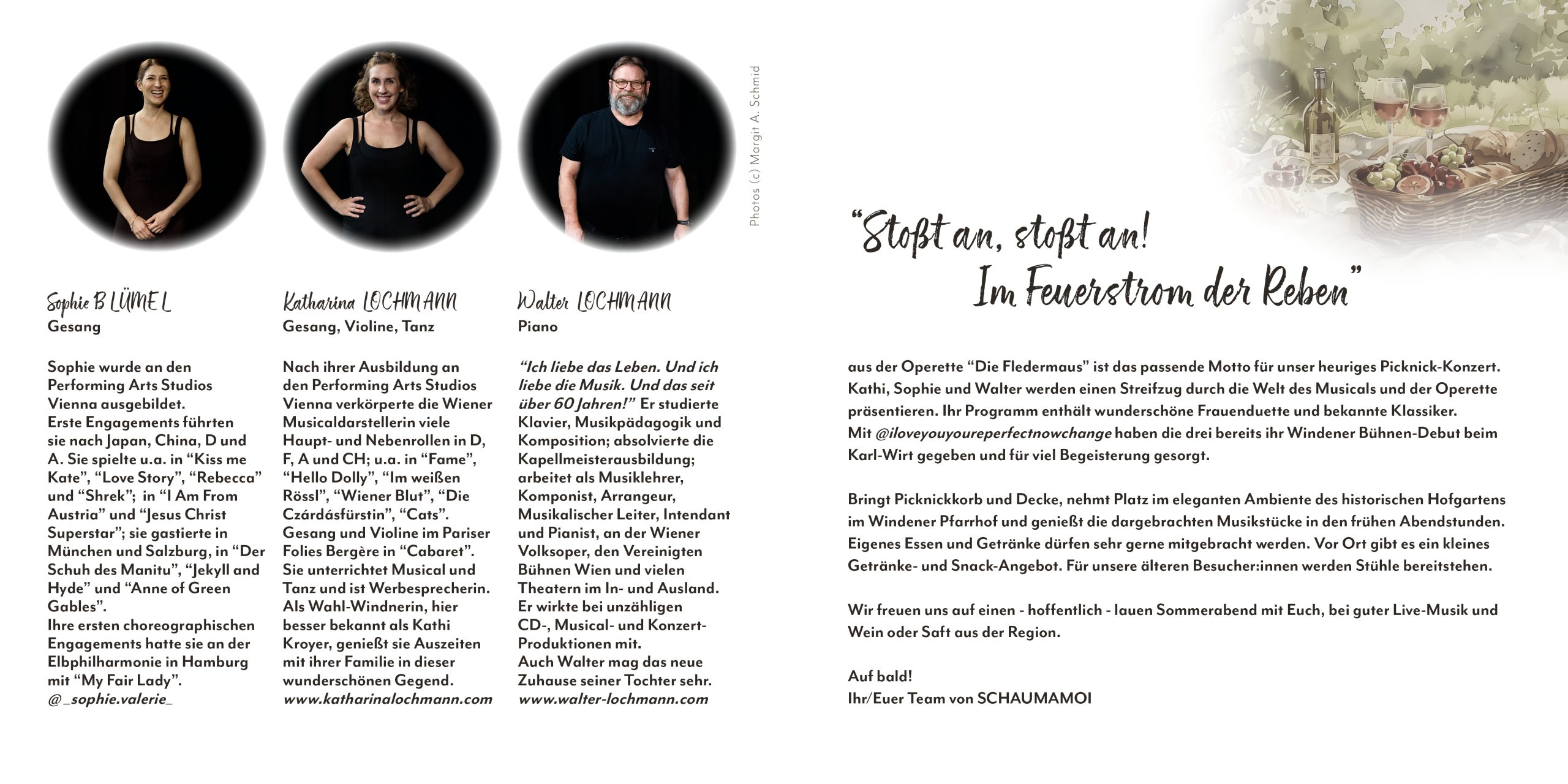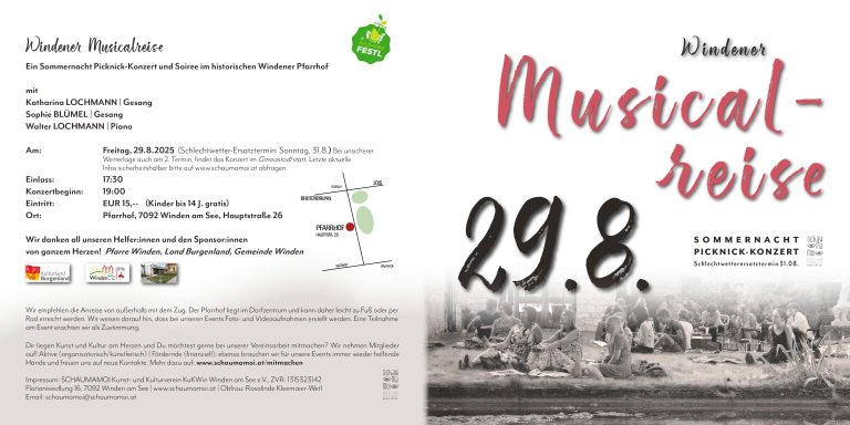 Ursprünglich geplant als Picknick-Konzert, fand die Musicalreise aufgrund von Wetterverschiebungen am Sonntag, den 31.8.2025 mit Bestuhlung und anderen Sitzgelegenheiten statt. Einige Besucher:innen brachten sogar ihre eigenen Picknick-Stühle mit und genossen die Darbietung von Kathi, Sophie und Walter mit Vergnügen.